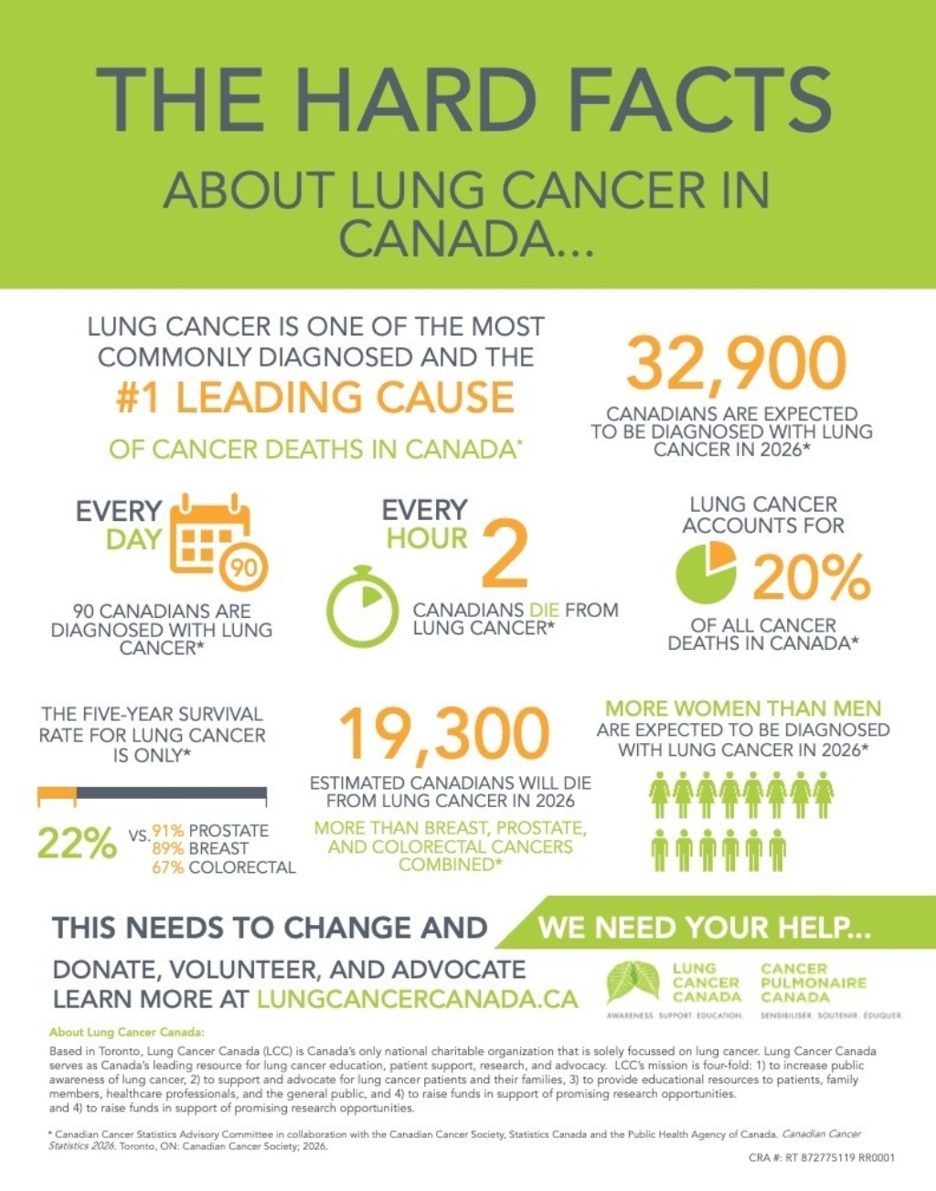 Lung cancer remains the leading cause of cancer death in Canada and is now the second most commonly diagnosed cancer in both men and women. An estimated 32,900 Canadians will be diagnosed with lung cancer this year, and approximately 19,300 will die from the disease—more than breast, prostate and colorectal cancers combined.